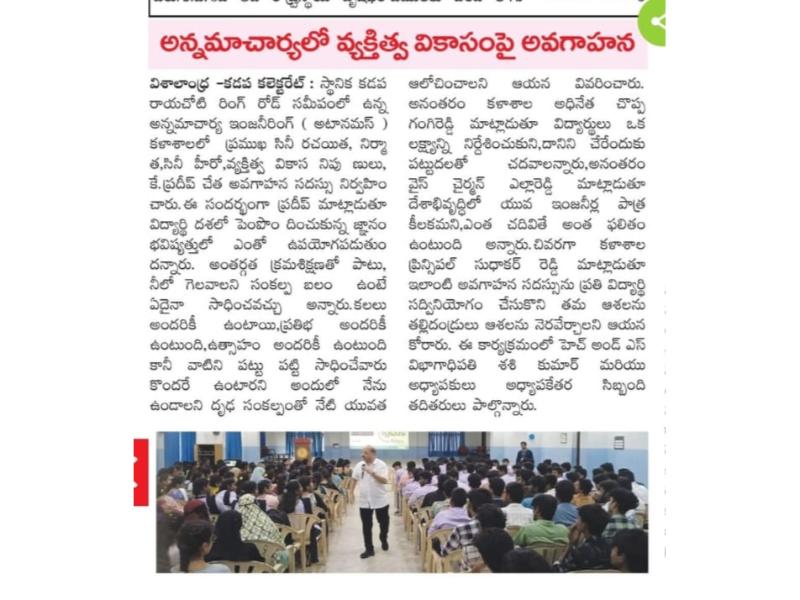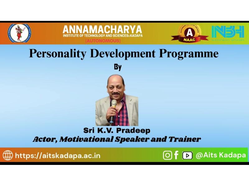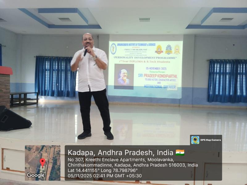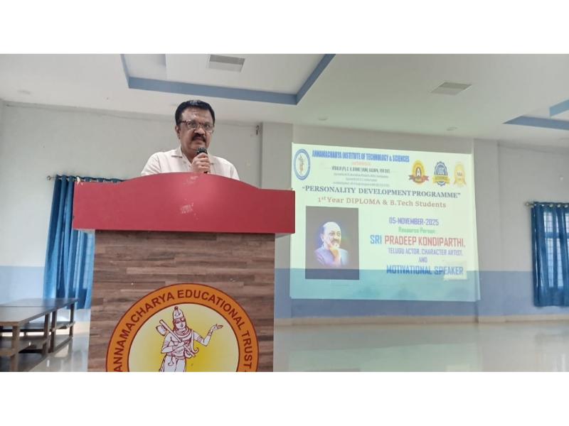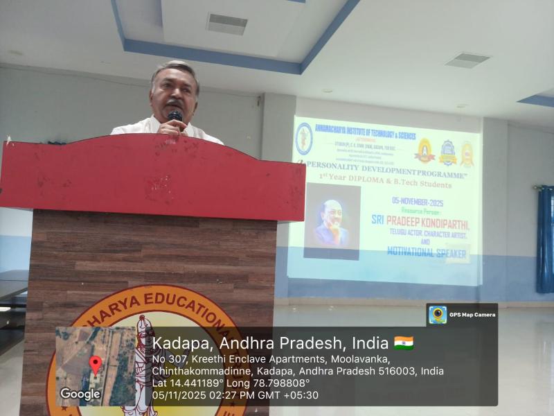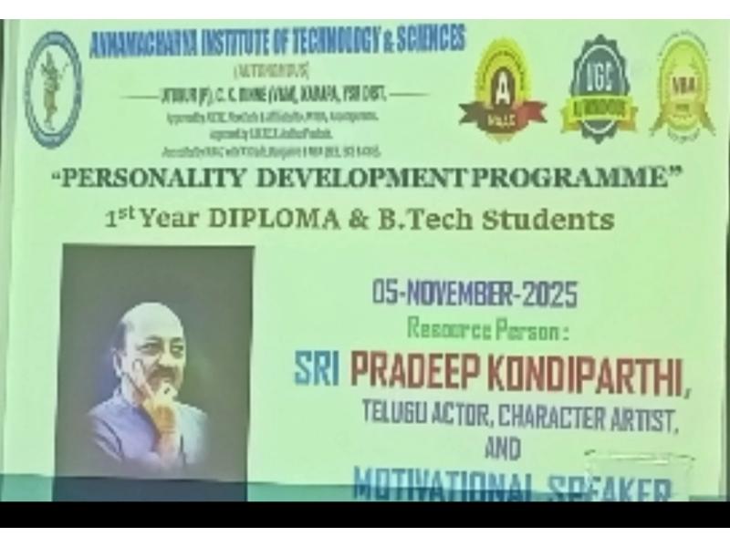 AITS, Kadapa conducted a Personality Development Programme for the I. B. Tech and Diploma students on 5th November 2025. The objective of conducting this programme is to enhance students’ mindset, behavior, and interactions to bring out their best. Senior Tollywood Actor Sri KV Pradeep Kumar graced the occasion as the chief guest and gave some tips to the students on how to master their minds. All I. B. Tech and Diploma students from several departments attended the programme. Sri C Gangi Reddy, Secretary, AITS Group, Sri C Yella Reddy, Vice Chairman, AITS Group and Dr A Sudhakara Reddy, Principal, AITS, Kadapa , Dr. K. N. Shasi Kumar , HoD, H&S, and H&S faculty graced the event.