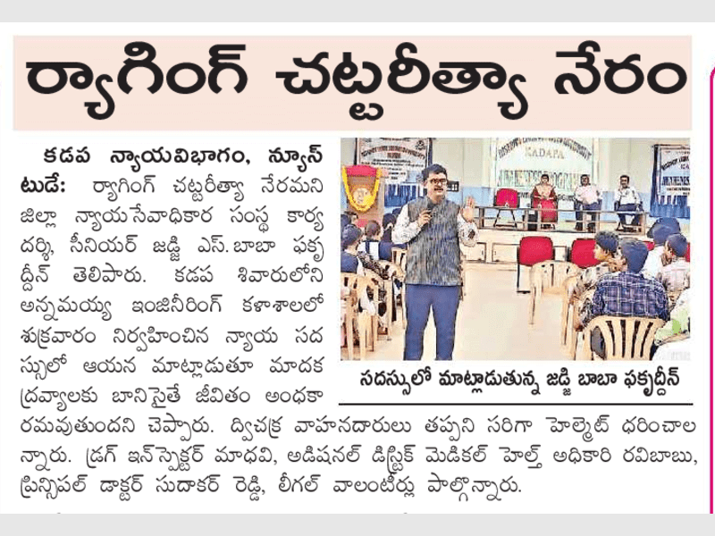 An “Awareness Program on Anti- Ragging & Drug prevention’ was organized by NSS Unit, AITS, Kadapa on 27th July, 2024. As chief guest S. Baba Fakruddin, Secretory cum Senior Civil judge, District Legal Services Authority, G. Madhavi, Drug Inspector and S. Ravi Babu Additional DMHO, Kadapa have attended. On This occasion, the judge said that if anyone directly or indirectly involve in the ragging, then they will be imprisoned for two years and fined ten thousand rupees. He also advised the youth that they should wear helmets and lead an addiction free life. In the event, Principal, Dr A Sudhakara Reddy, NSS Programme officer, Dr T Sankar Reddy, Physical Director A. Rajesh, faculty members along with 150 members of NSS volunteers were present and made the event successful.