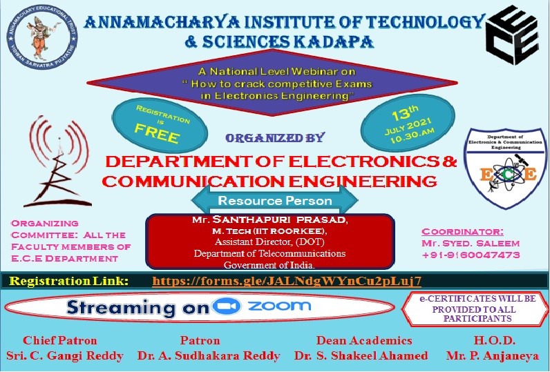 The Department of Electronics & Communication Engineering of ‘Annamacharya Institute of Technology and Sciences’ organized a National Level Online e-quiz from 03/07/2020 to 05/07/2020. Registrations were free. E-Quiz for Basic Electronics was scheduled on 3rd July, 2020, for Communication Engineering was scheduled on 4th July, 2020 and for VLSI Design was scheduled on 5th July, 2020. The quiz was open for all and active participation with 50% of marks was awarded E-Certificates. Each day 100 certificates were issued for eligible participants.